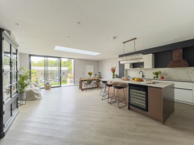 Renovated property, features a large modern kitchen/dining space with a terracotta floor and crittal doors. South west London. (new location 2024)