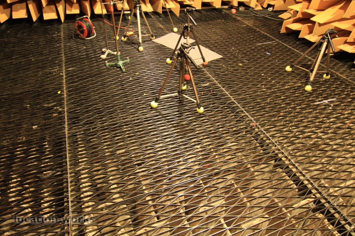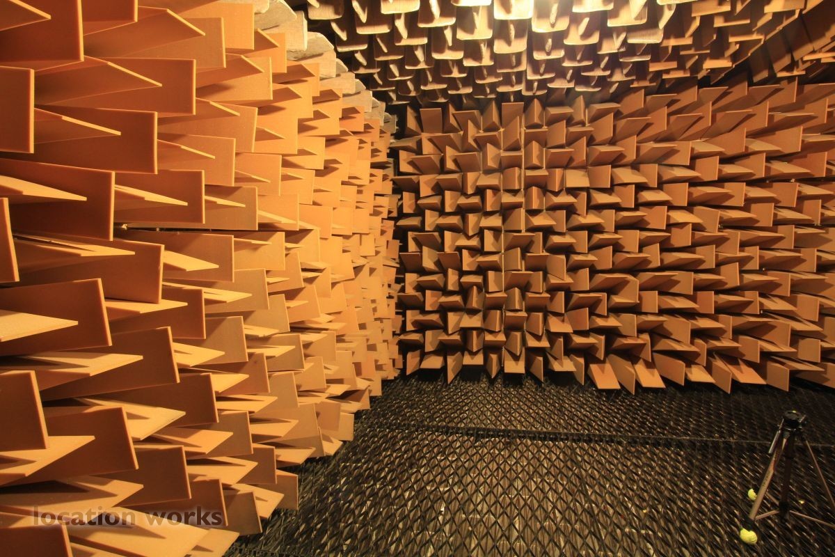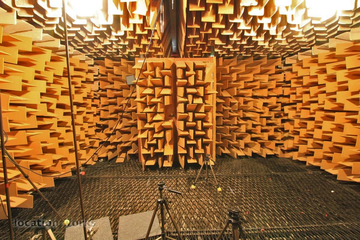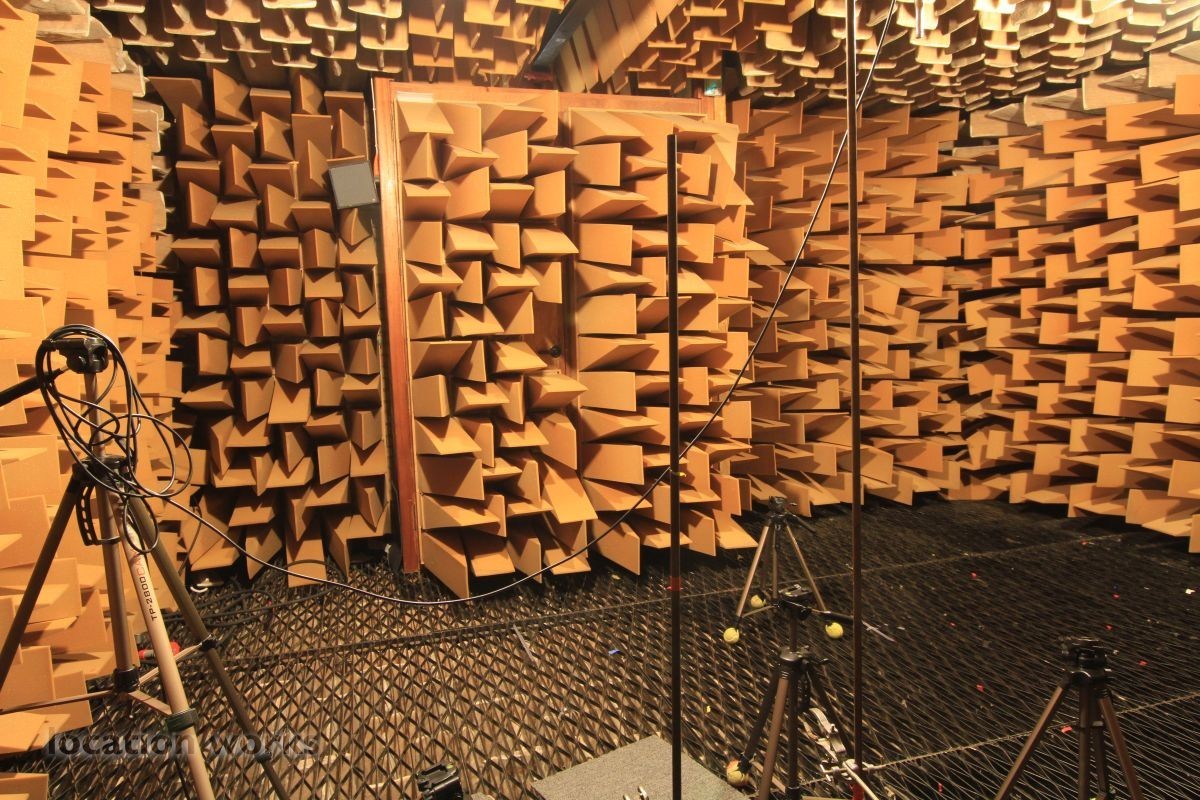 Almost perfect acoustic isolation is achieved by a "box in a box" construction made of very heavy concrete walls and internal surfaces made of 70cm long foam wedges and large, heavy sound-proof doors. The inner box is mounted on springs to avoid the transmission of vibration from London Underground trains which run underneath the chamber. The suspended floor is made from a metal grill so that heavier equipment, up to 50kg, can be measured. This chamber allows sound power levels to be accurately determined, frequency responses to be measured and pure recordings to be made. Recordings can later be processed to create aural simulations of virtual environments.