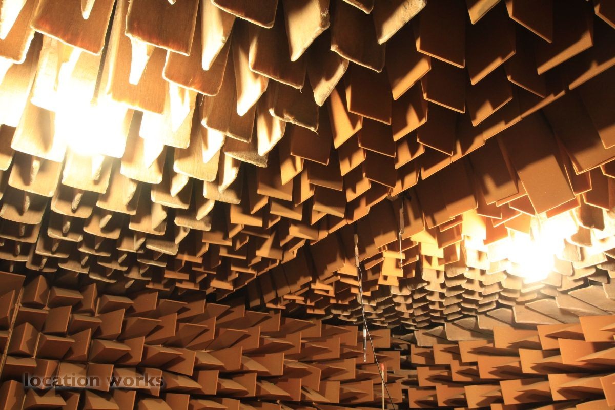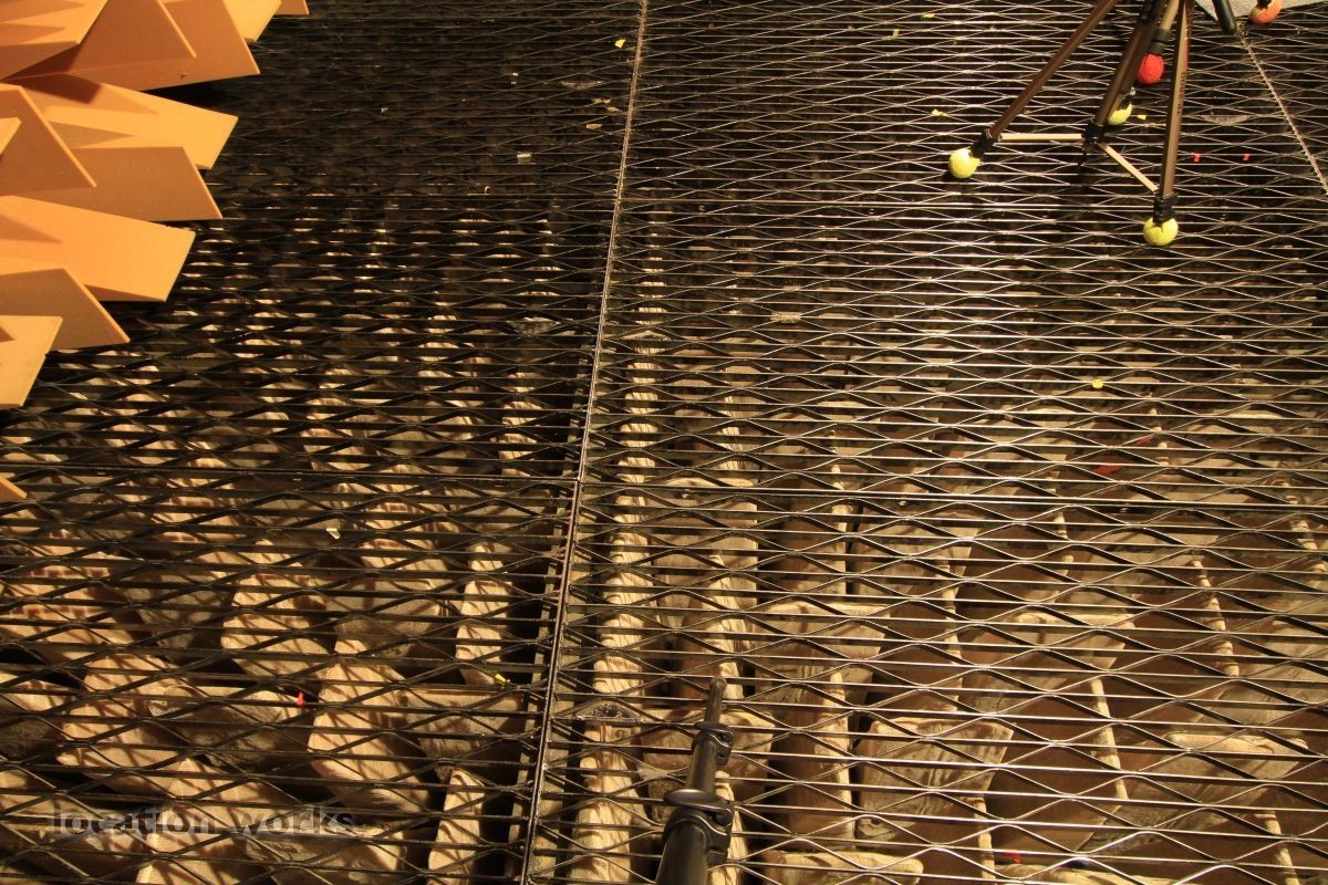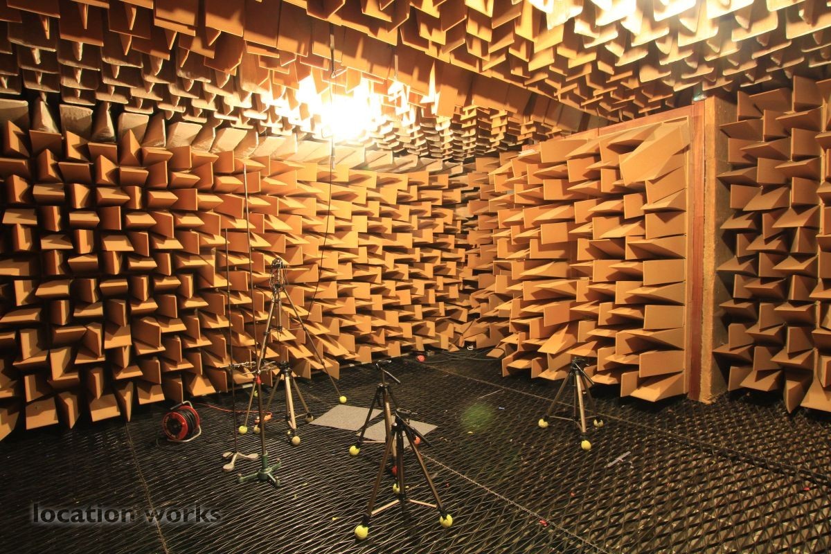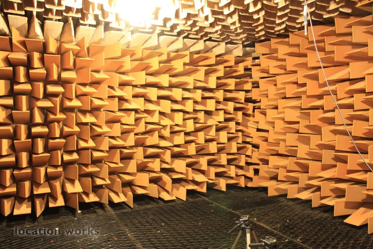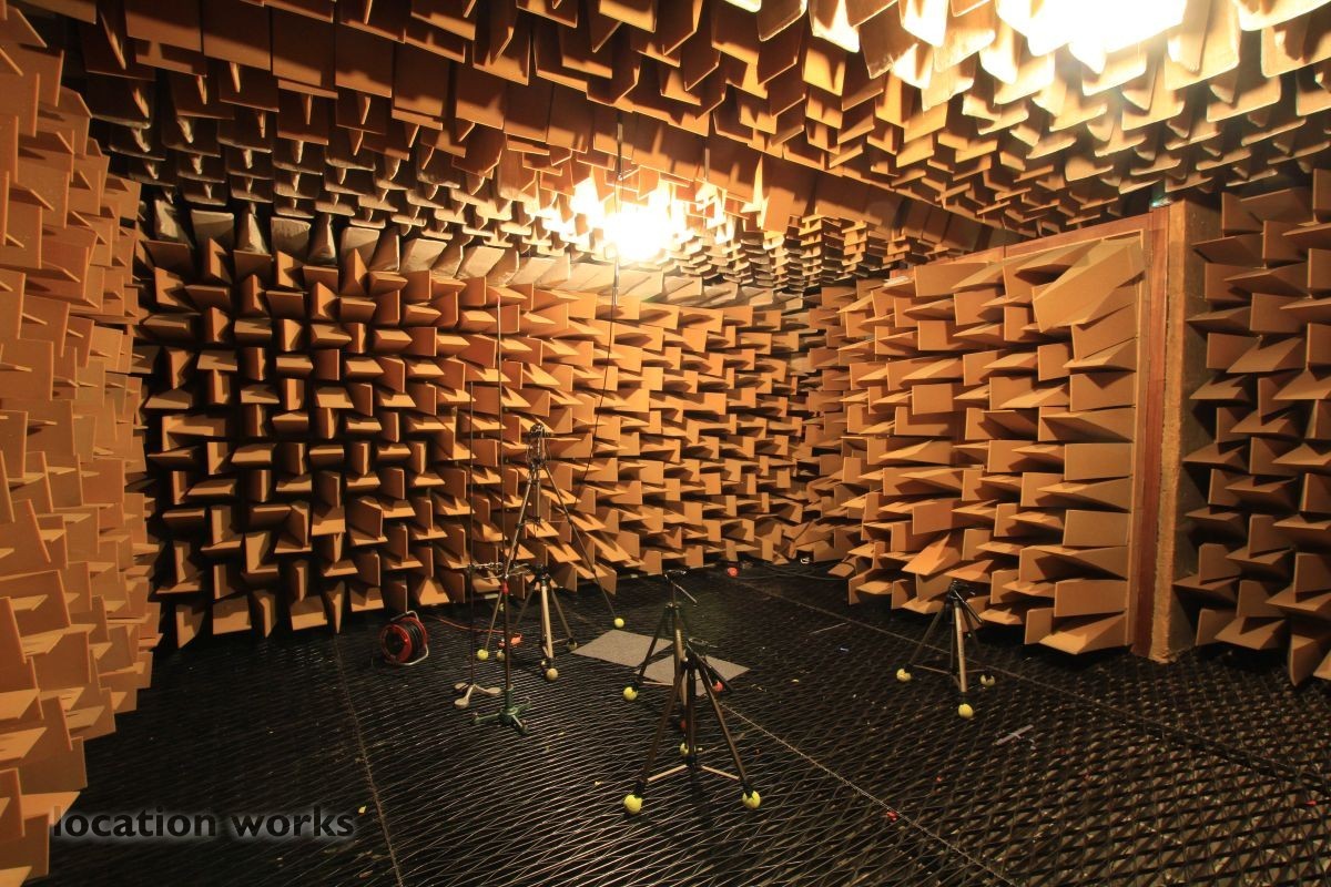 Almost perfect acoustic isolation is achieved by a "box in a box" construction made of very heavy concrete walls and internal surfaces made of 70cm long foam wedges and large, heavy sound-proof doors. The inner box is mounted on springs to avoid the transmission of vibration from London Underground trains which run underneath the chamber. The suspended floor is made from a metal grill so that heavier equipment, up to 50kg, can be measured. This chamber allows sound power levels to be accurately determined, frequency responses to be measured and pure recordings to be made. Recordings can later be processed to create aural simulations of virtual environments.
