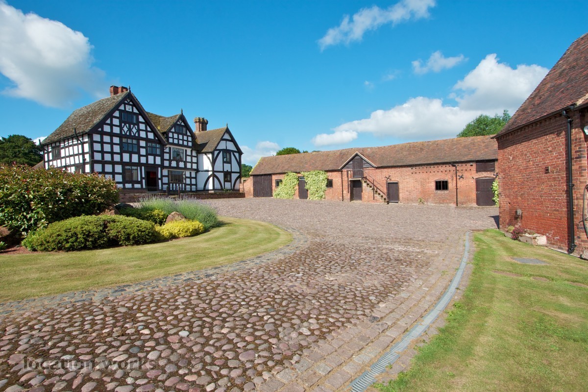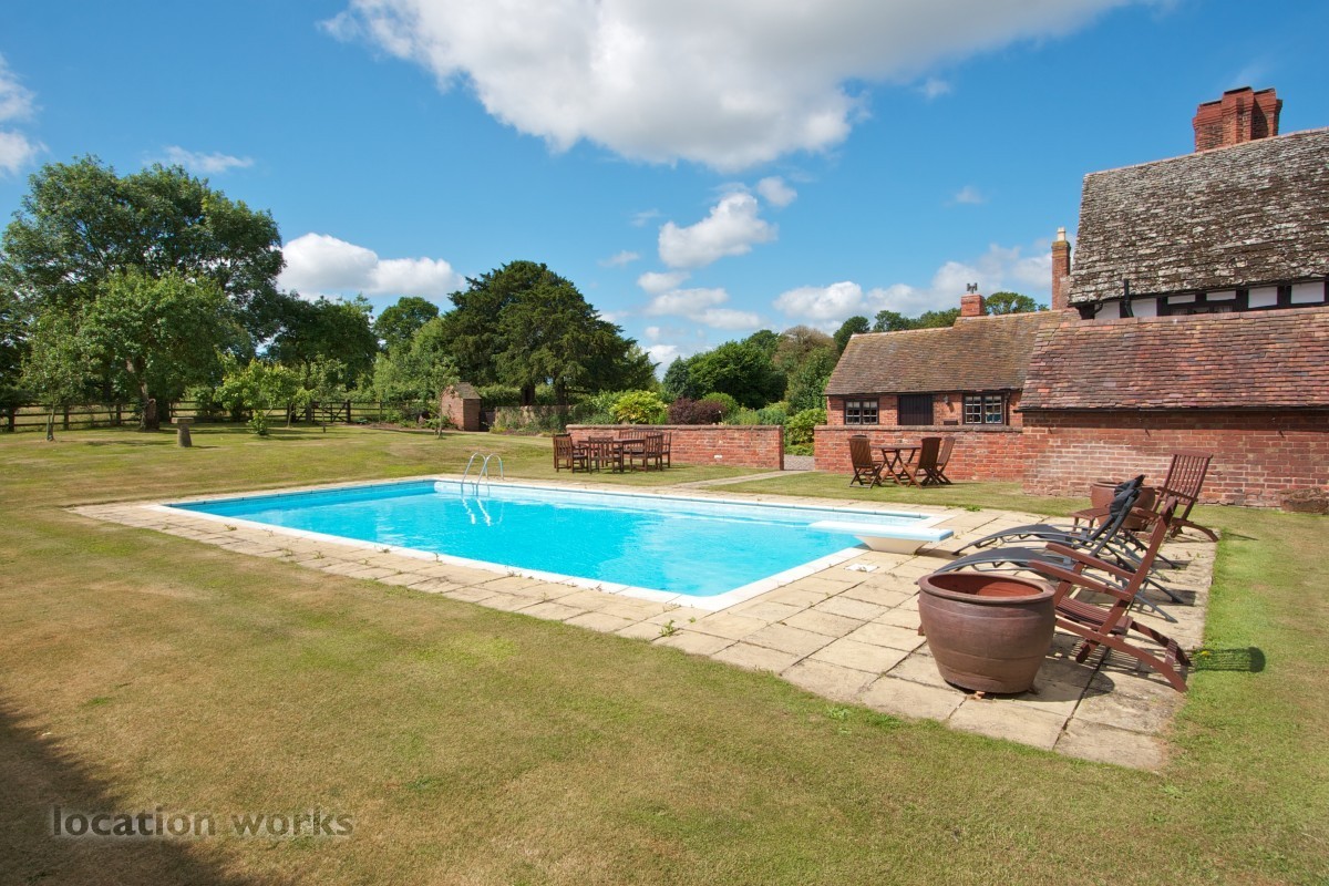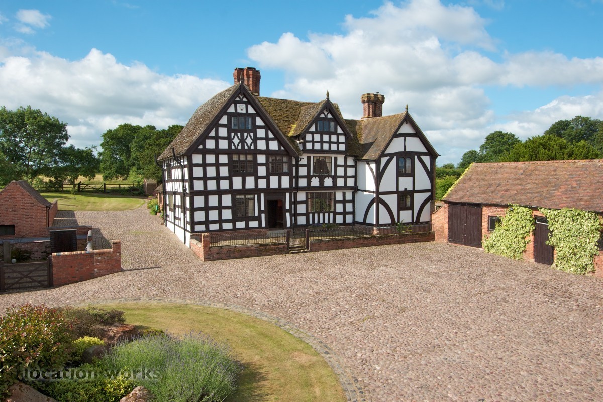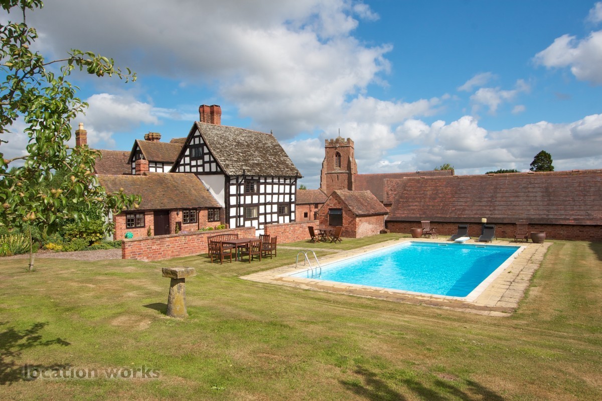 Charming 17thC timber-framed country house with courtyard and outbuildings, mature gardens, meadowland and outdoor pool. Shropshire.