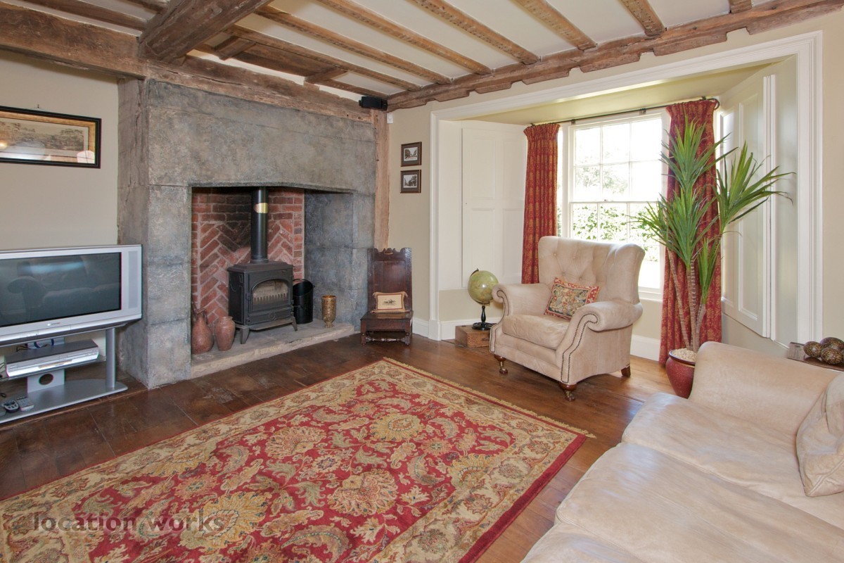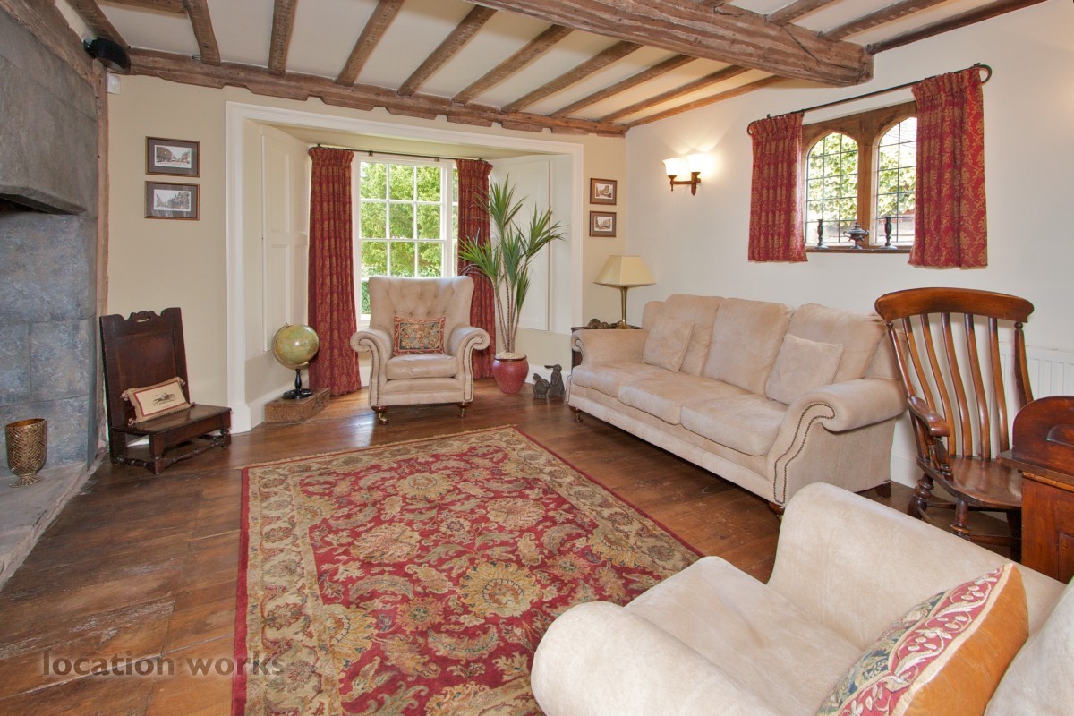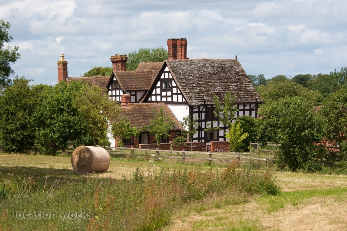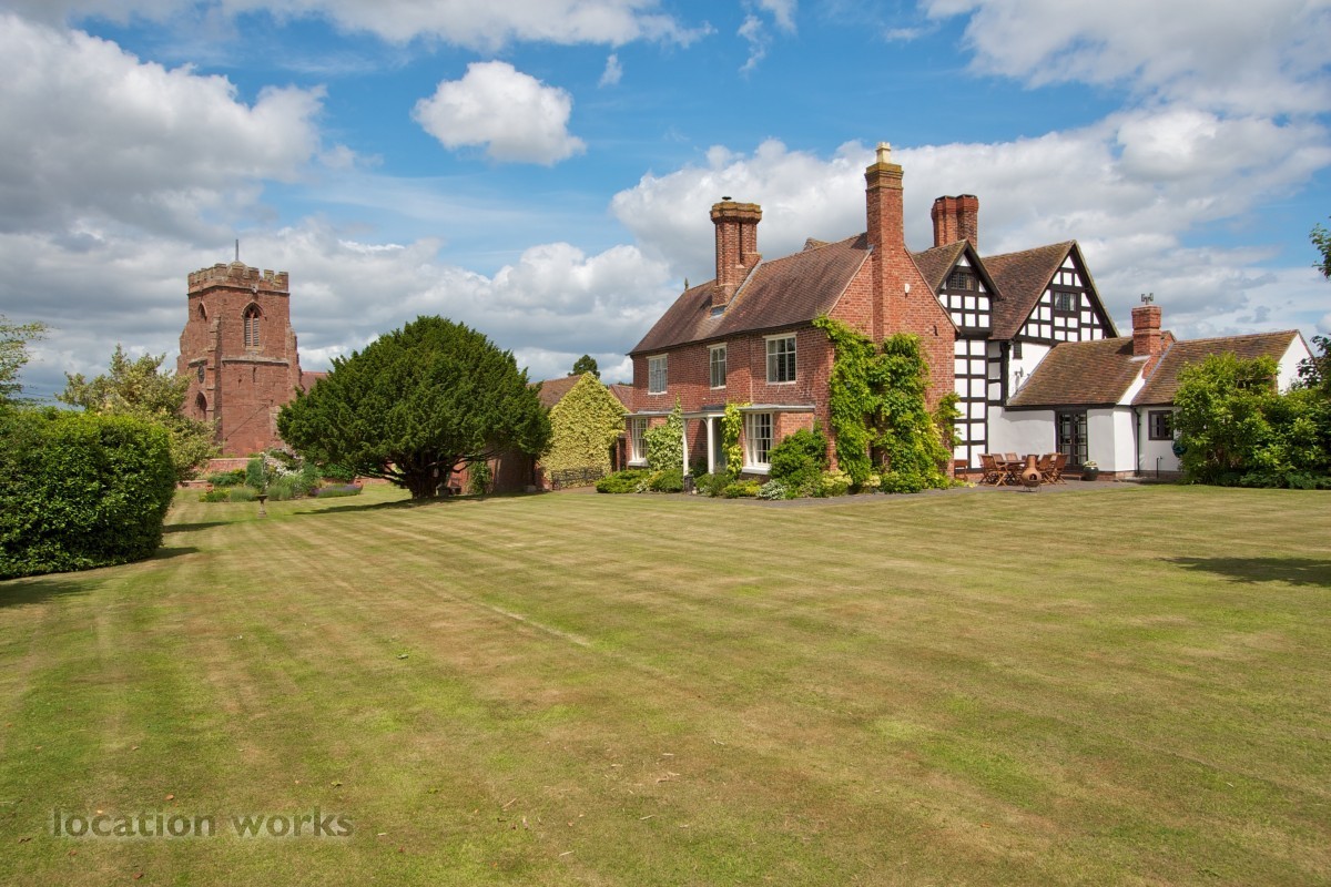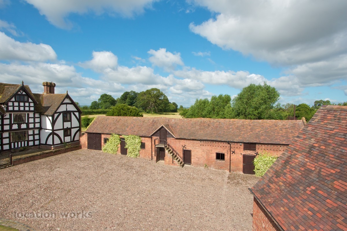 Charming 17thC timber-framed country house with courtyard and outbuildings, mature gardens, meadowland and outdoor pool. Shropshire.