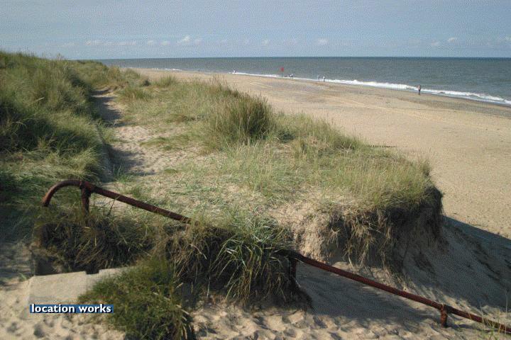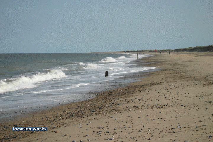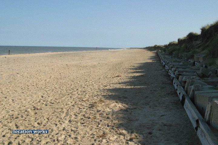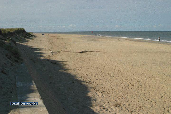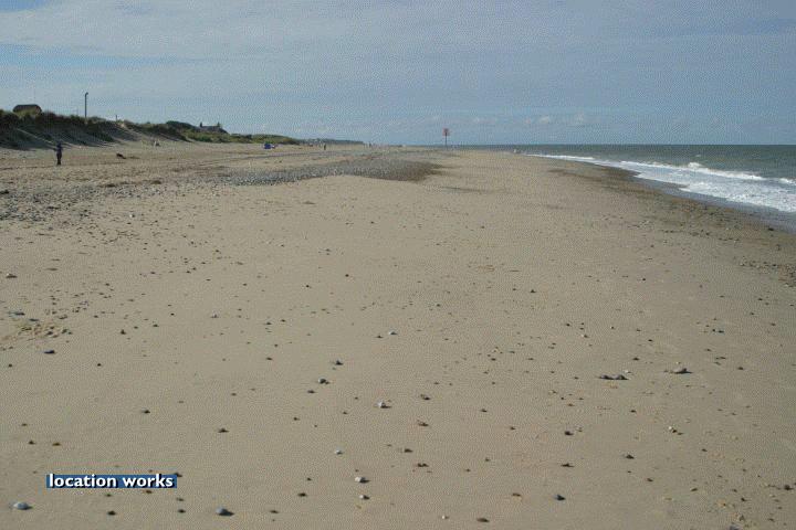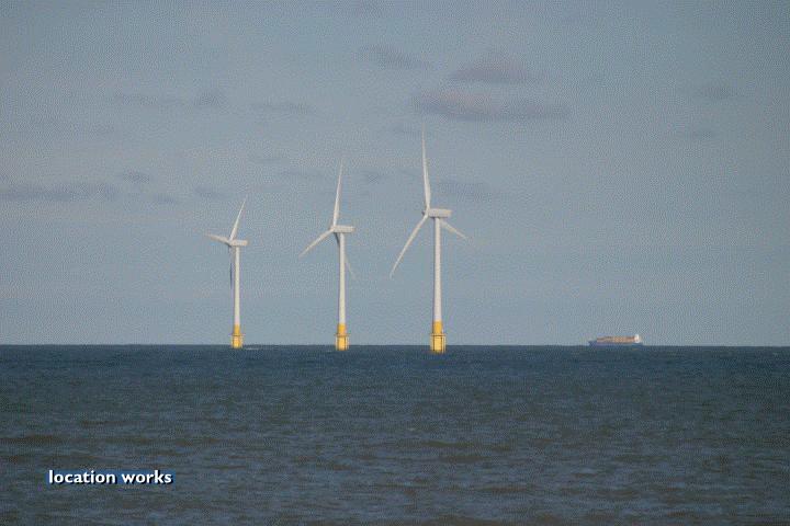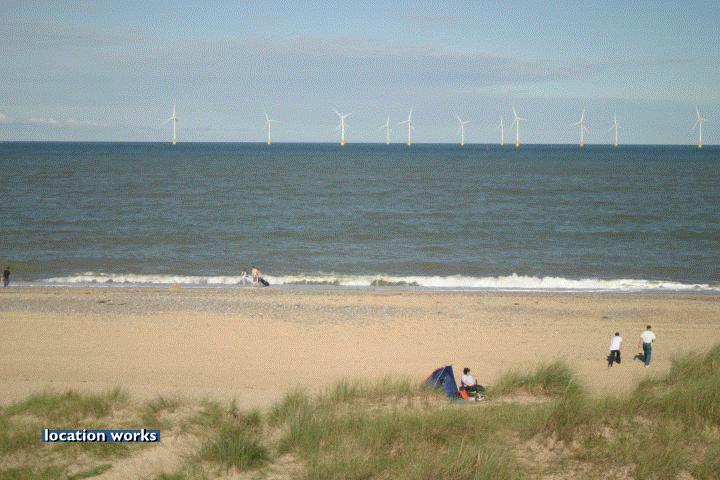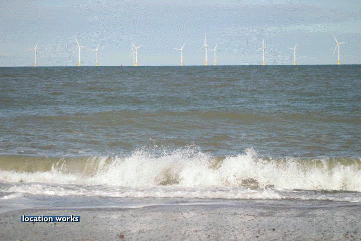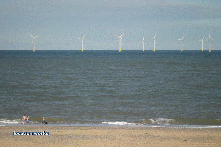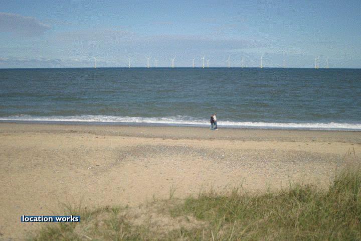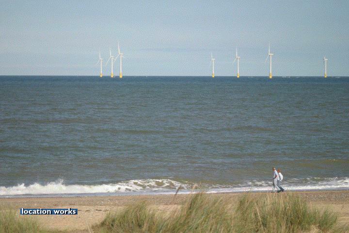 | Sandy beach by an off-shore wind farm, Norfolk.