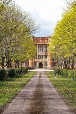 Science block set within the grounds of an academic institution, including an observatory and lake. Hertfordshire.