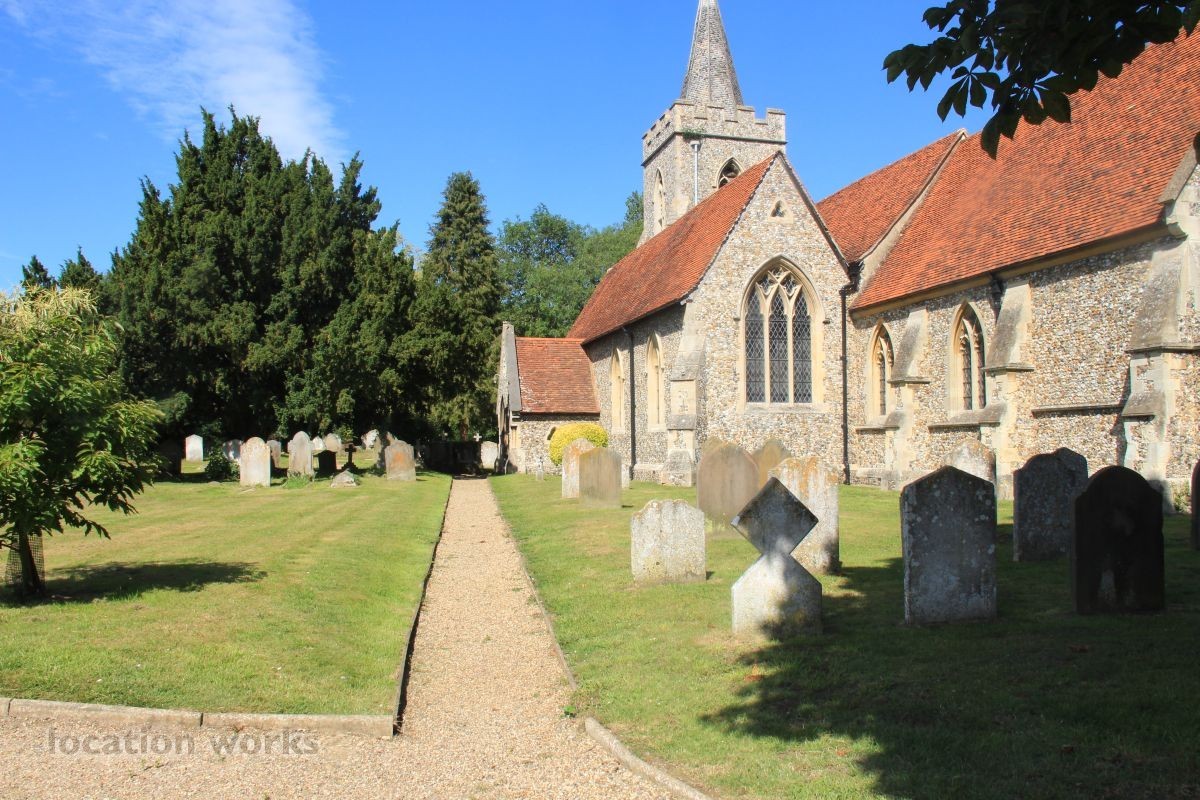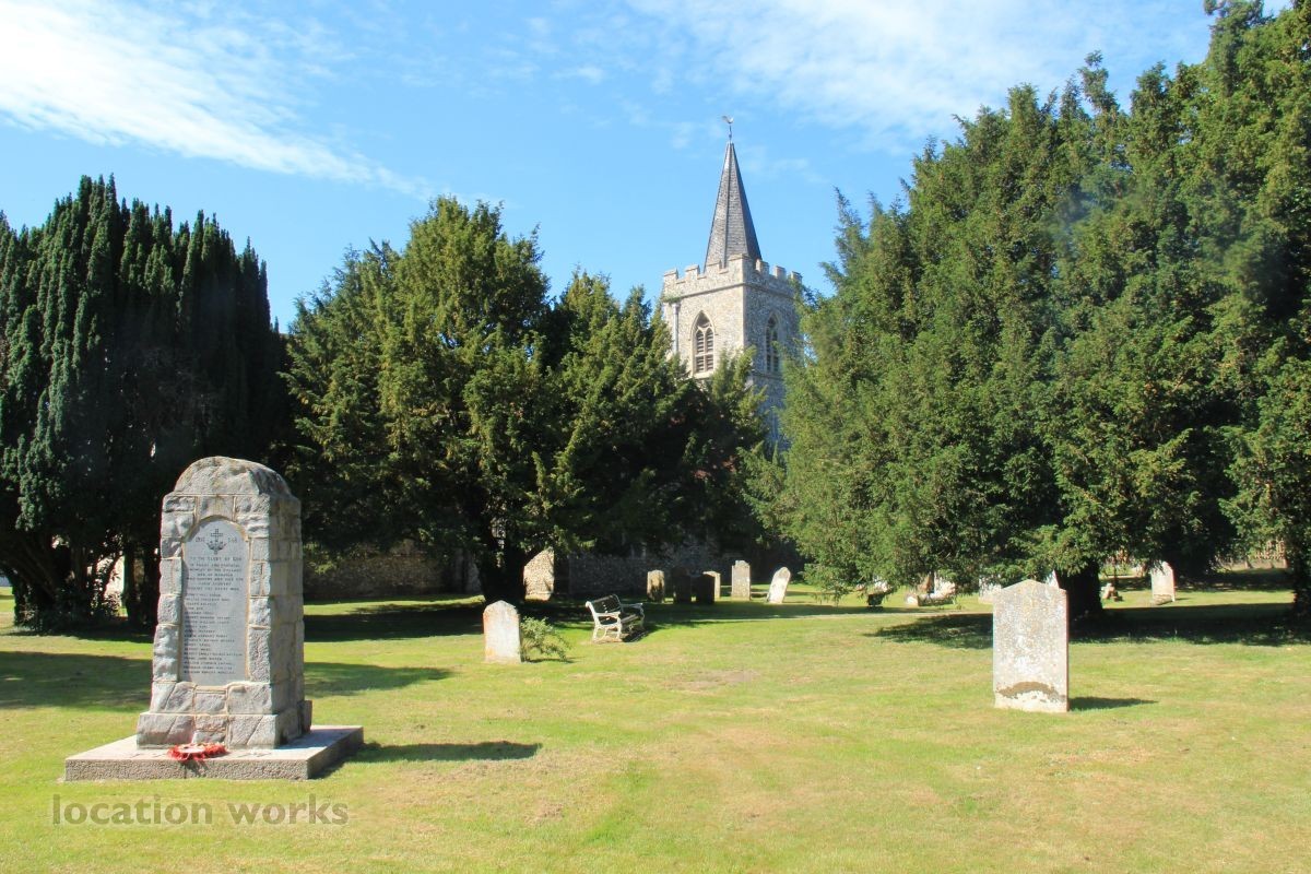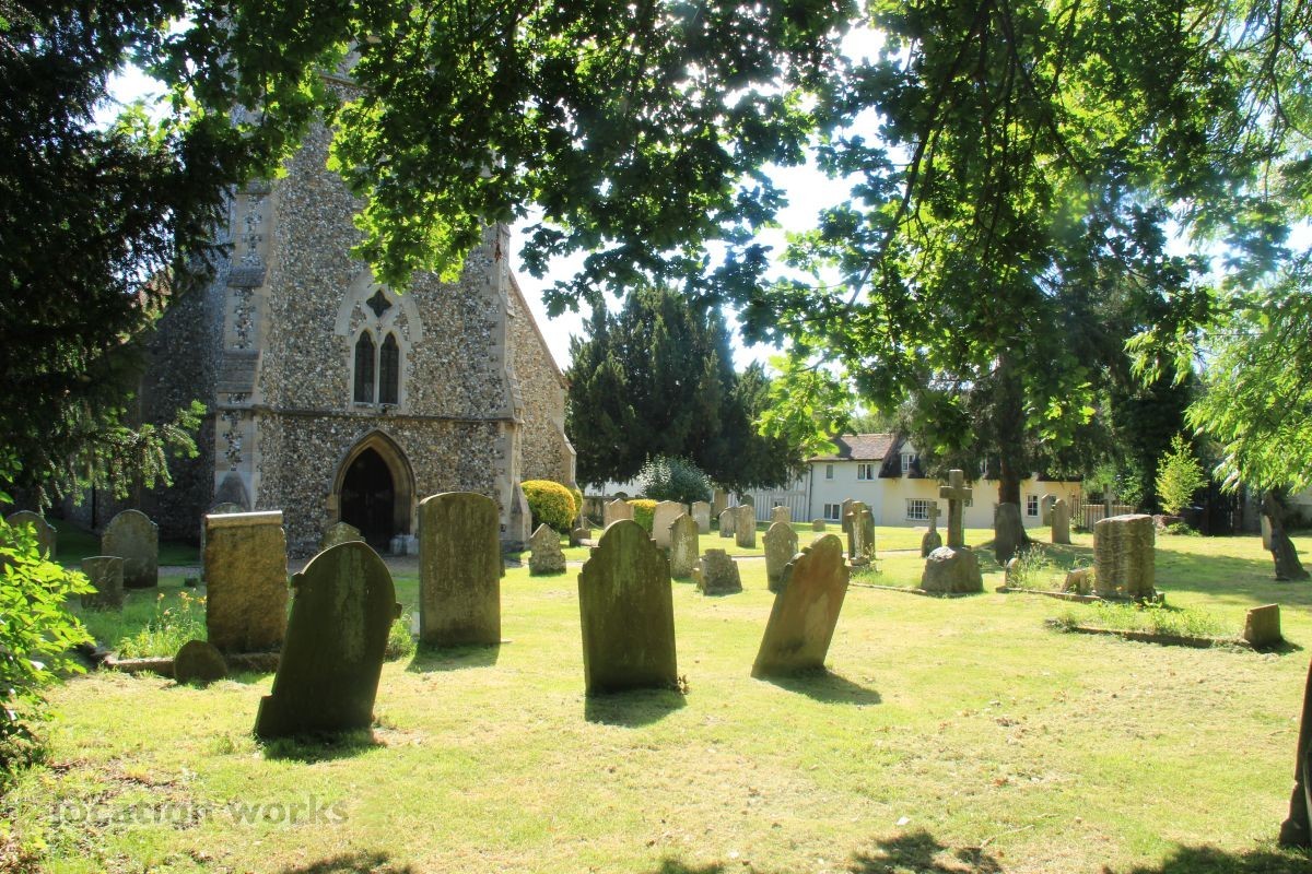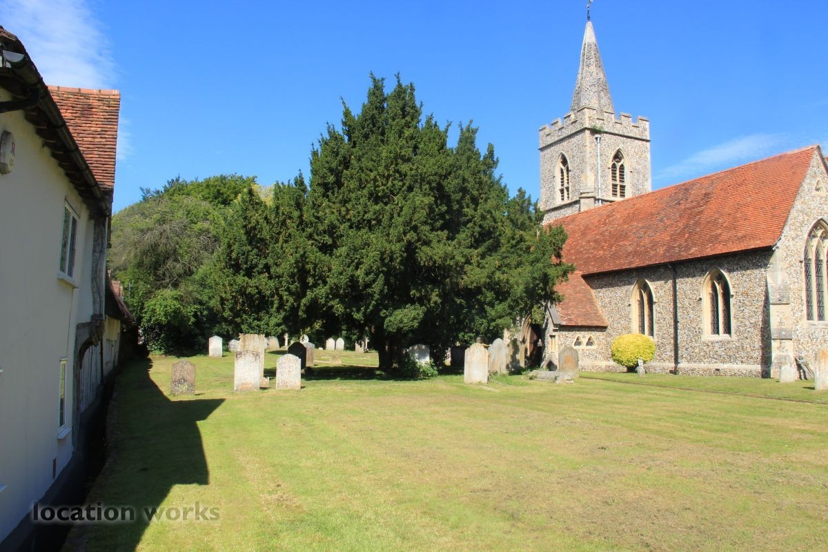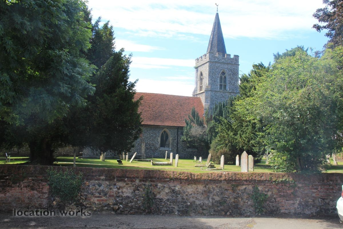 Village Church and graveyard near open fields. Hertfordshire.