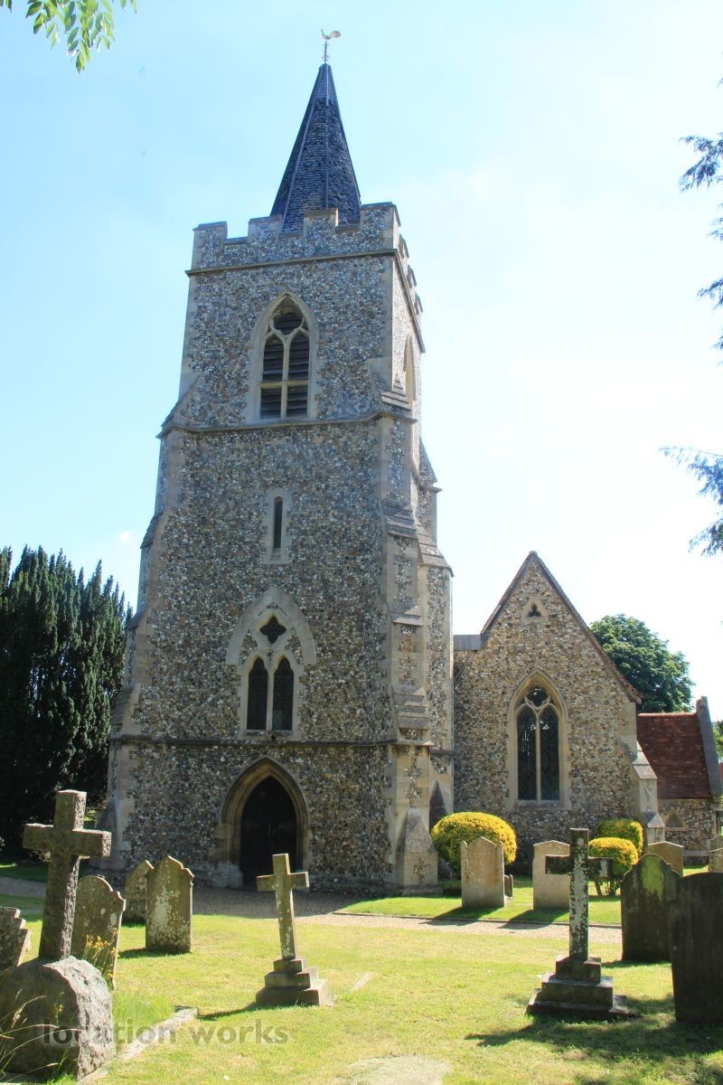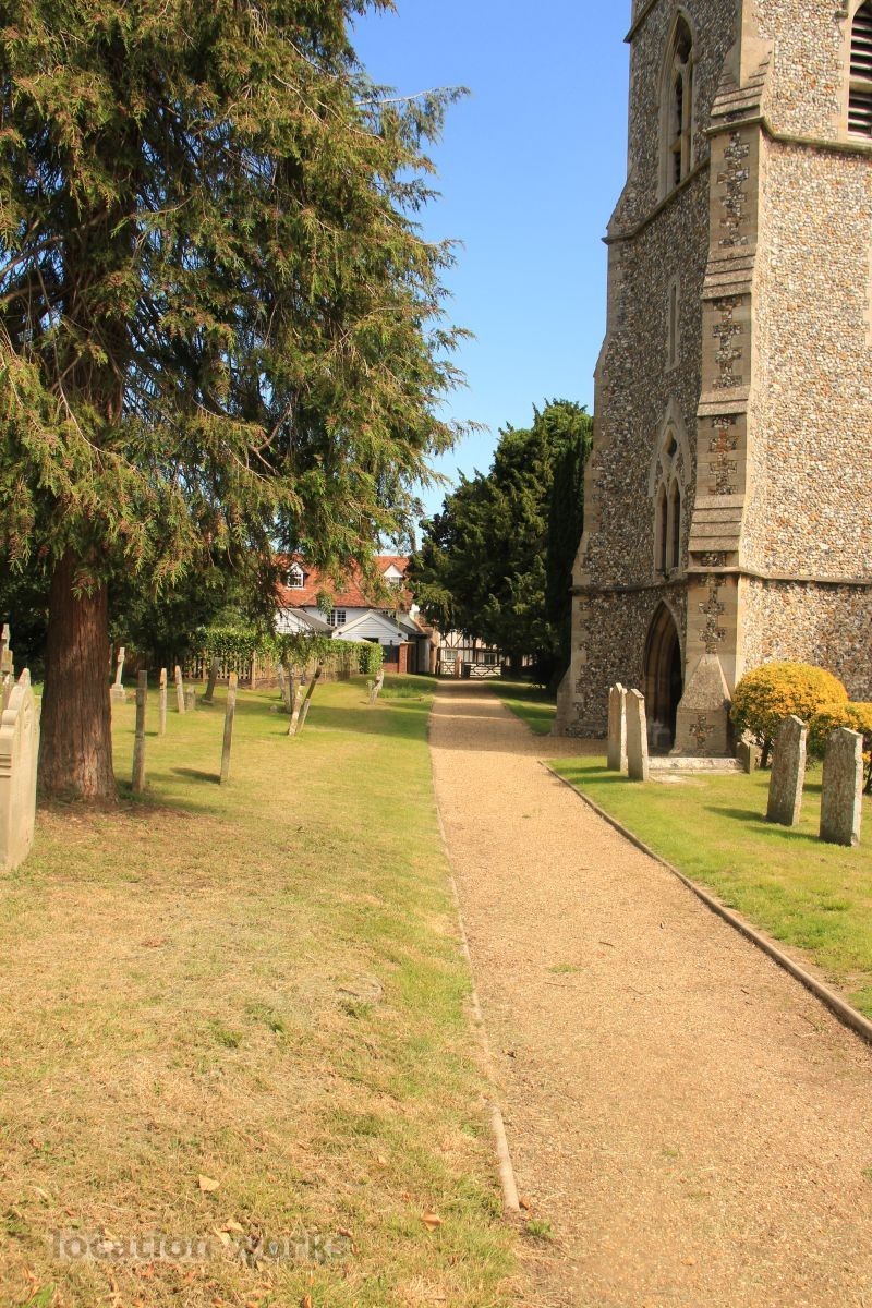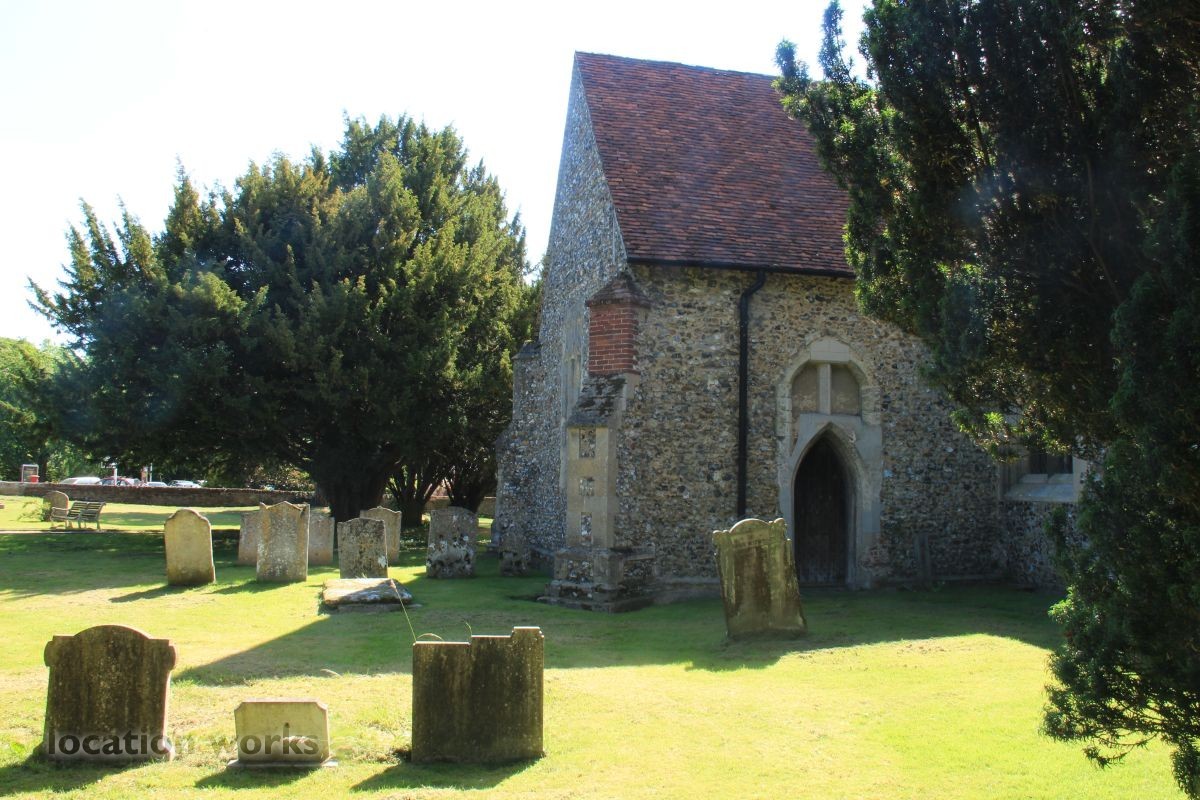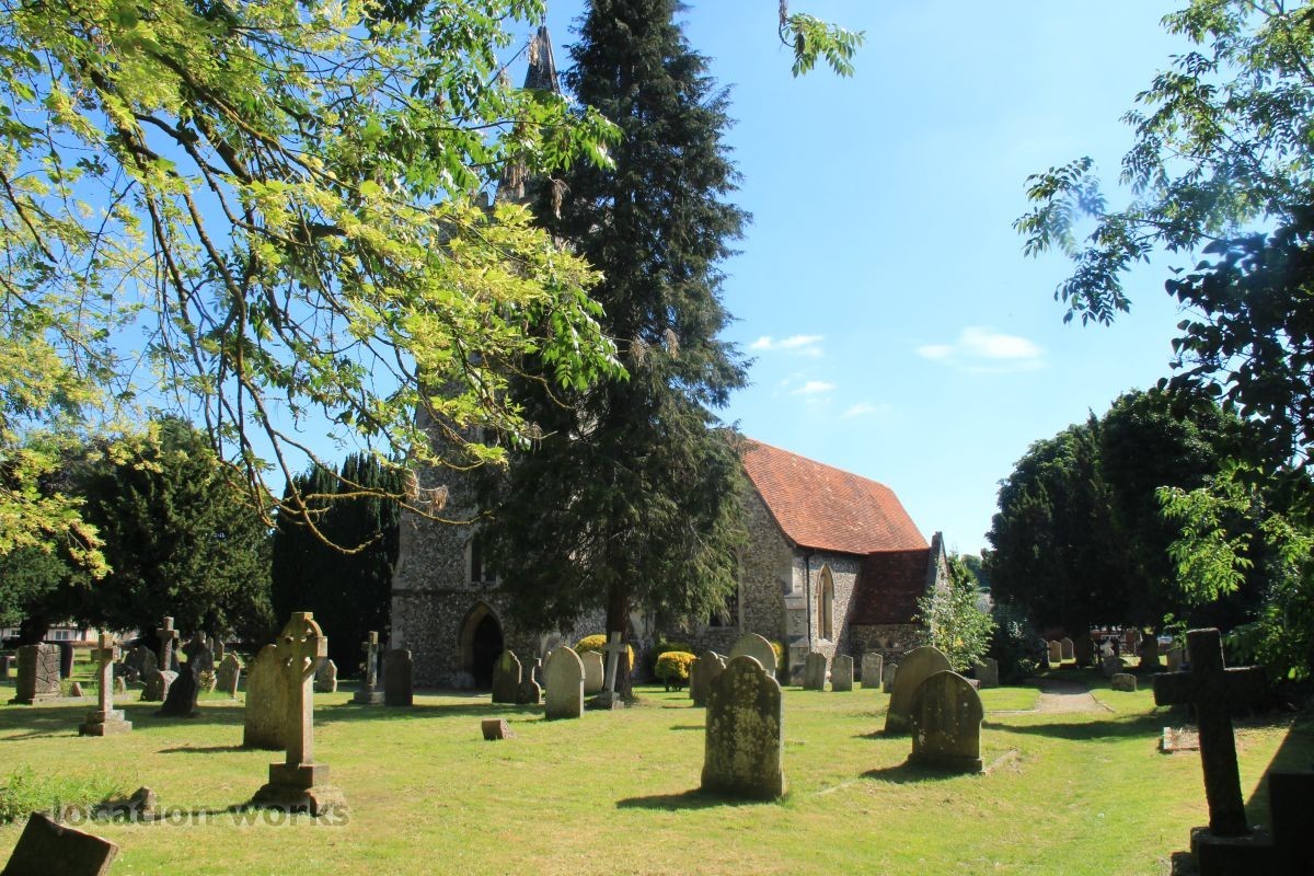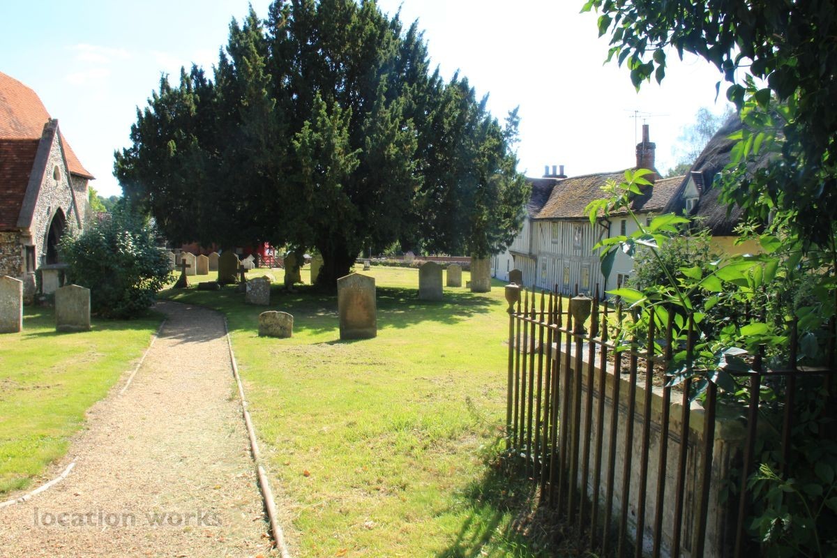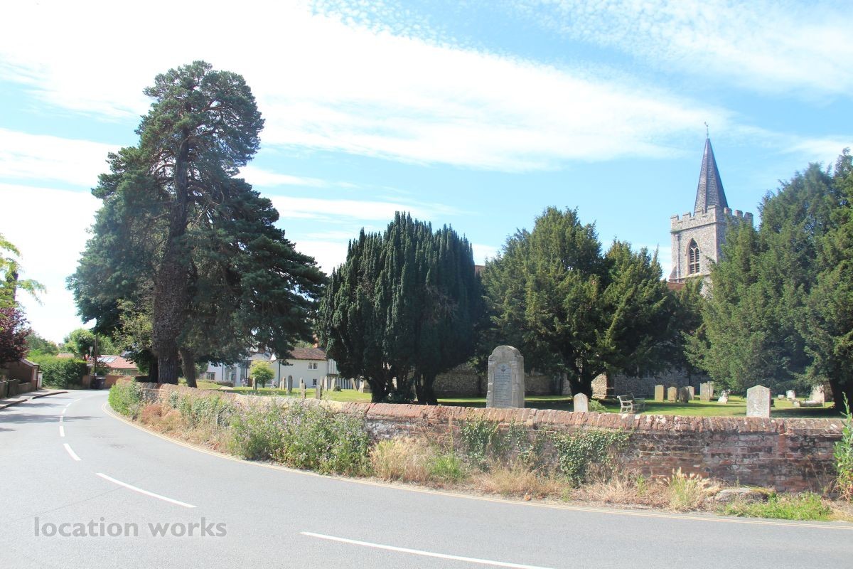 Village Church and graveyard near open fields. Hertfordshire.