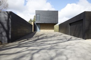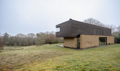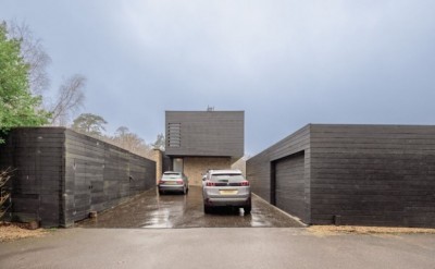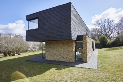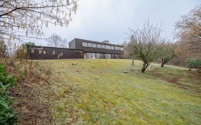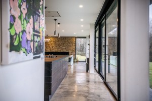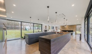 Architect designed, open plan family home, including a kitchen with a concrete floor and two kitchen islands, in a countryside setting. West Sussex.